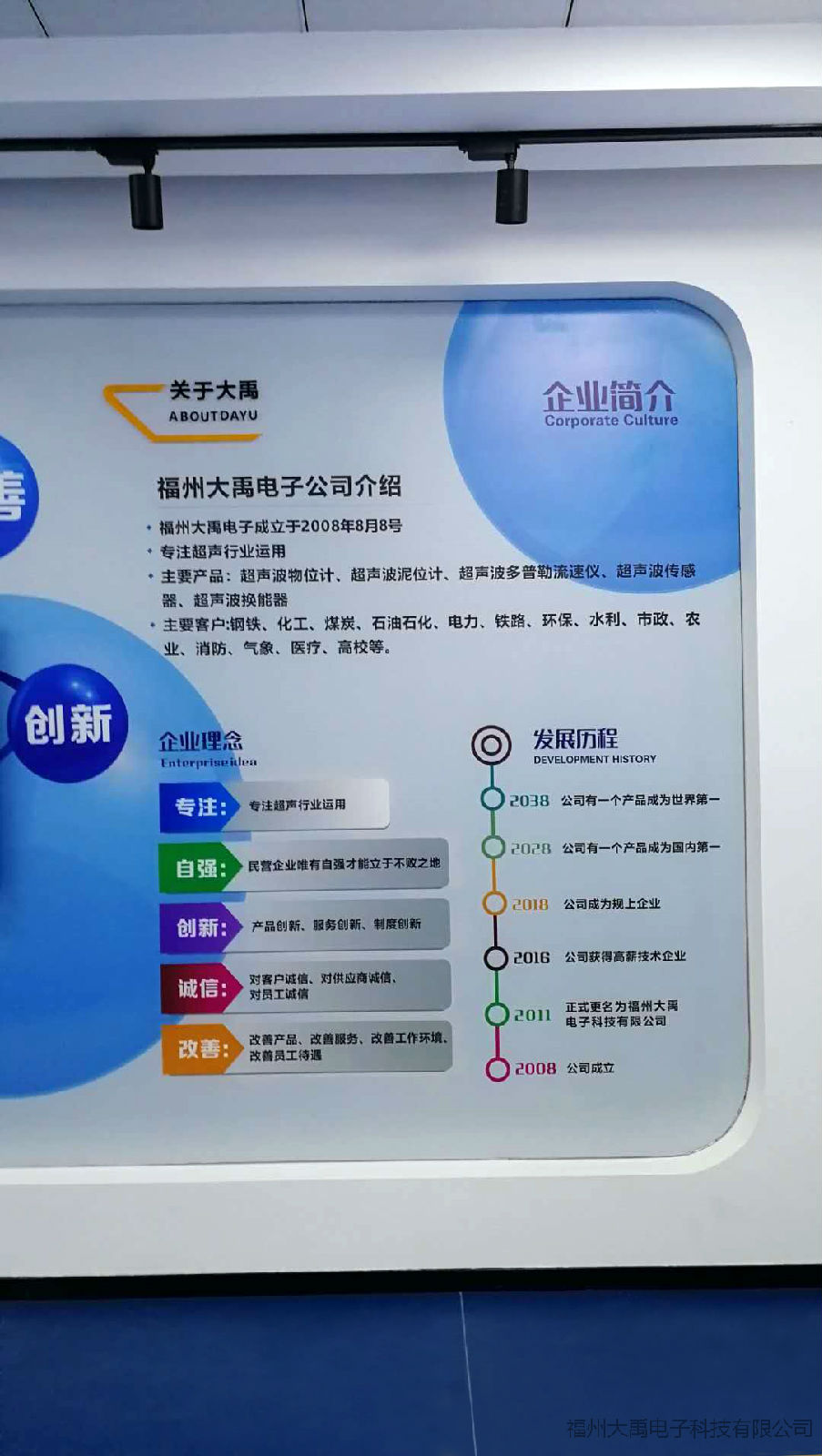 2018是個好年頭,習大大常說:讓美好愿景變為現實。現在,大禹電子實現了許久以來我們這些超聲波大禹人的美好理想及追求。自2016年大禹電子被評為福建省高新技術企業以來,通過我們堅持不懈的努力,公司又開發了近幾十款新型的換能器及高品質的超聲波液位計新款,以及超聲波多普勒流量計小型流量計。近來,新的展廳也順利完成!分別展出本公司生產的眾多超聲波產品系列。
